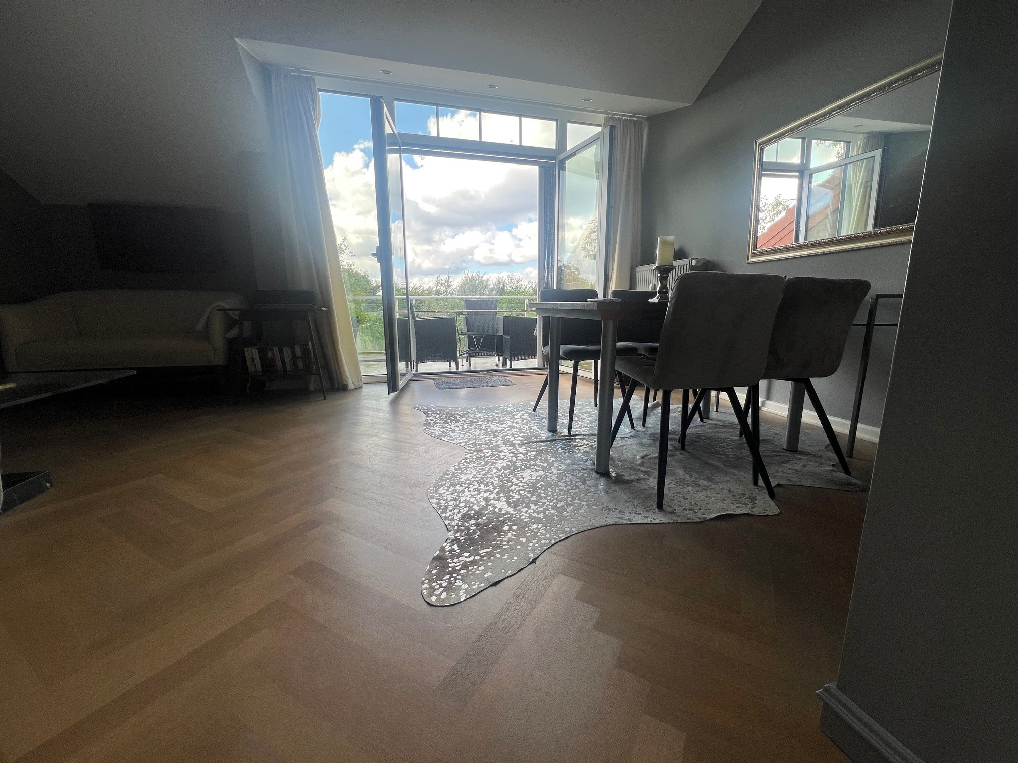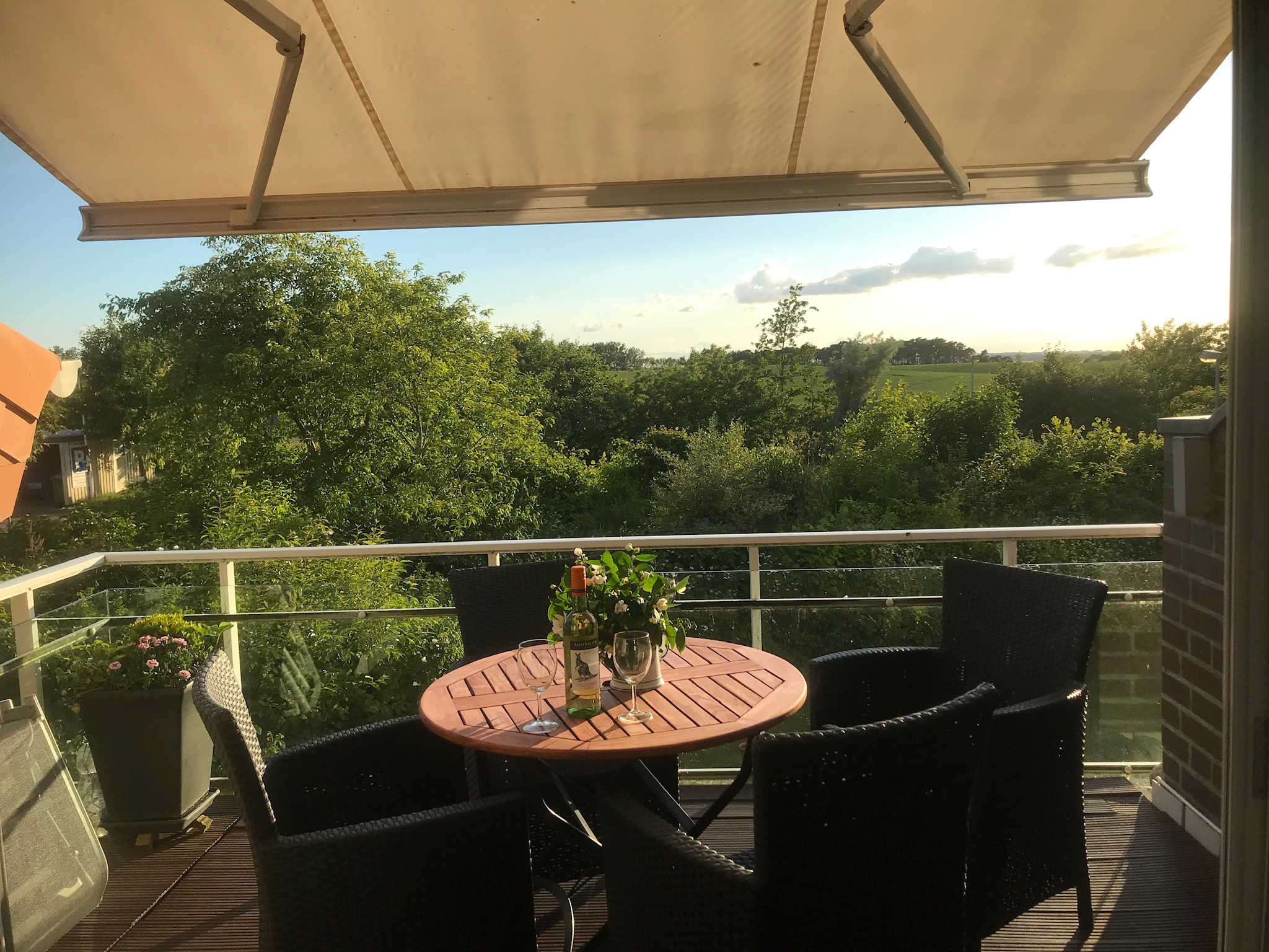 Sie liegt im 1. Obergeschoß und ist sehr sonnig ausgerichtet mit seiner geräumigen Balkonterrasse in Westrichtung und Weitblick bis zur Ostsee!