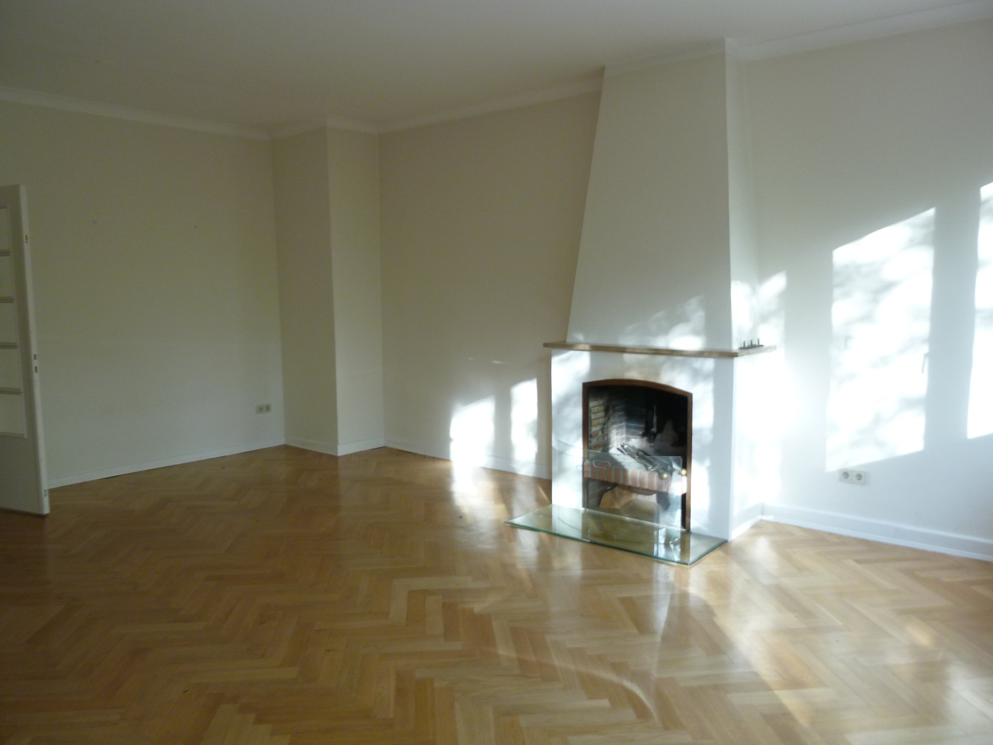 Der Kamin im Wohn-Esszimmer ist ein Winter-Highlight. Hier ist auch eine Tür zum Schlafzimmer, das ca. 25qm mißt. Dort steht ein großer weißer Einbauschrank. Die großen nach Westen gerichteten Fenster lassen viel Sonnenschein in die Wohnung. Der Flur wird durch die verglaste Wohnzimmertür bestens belichtet.