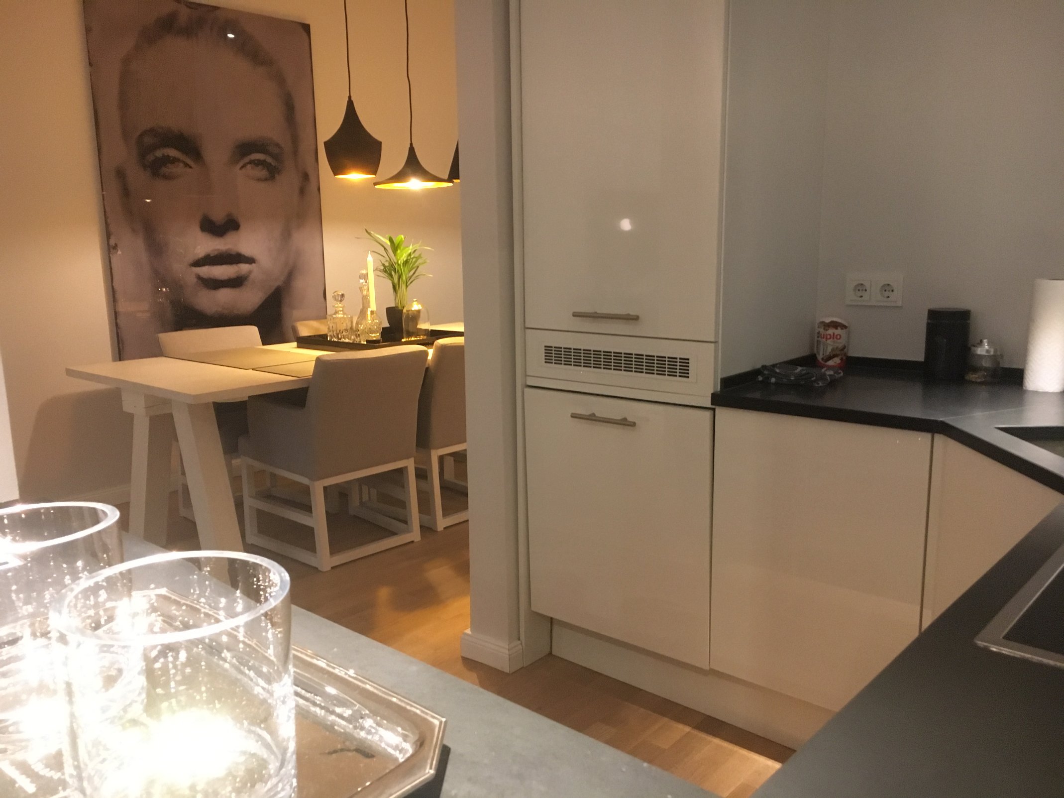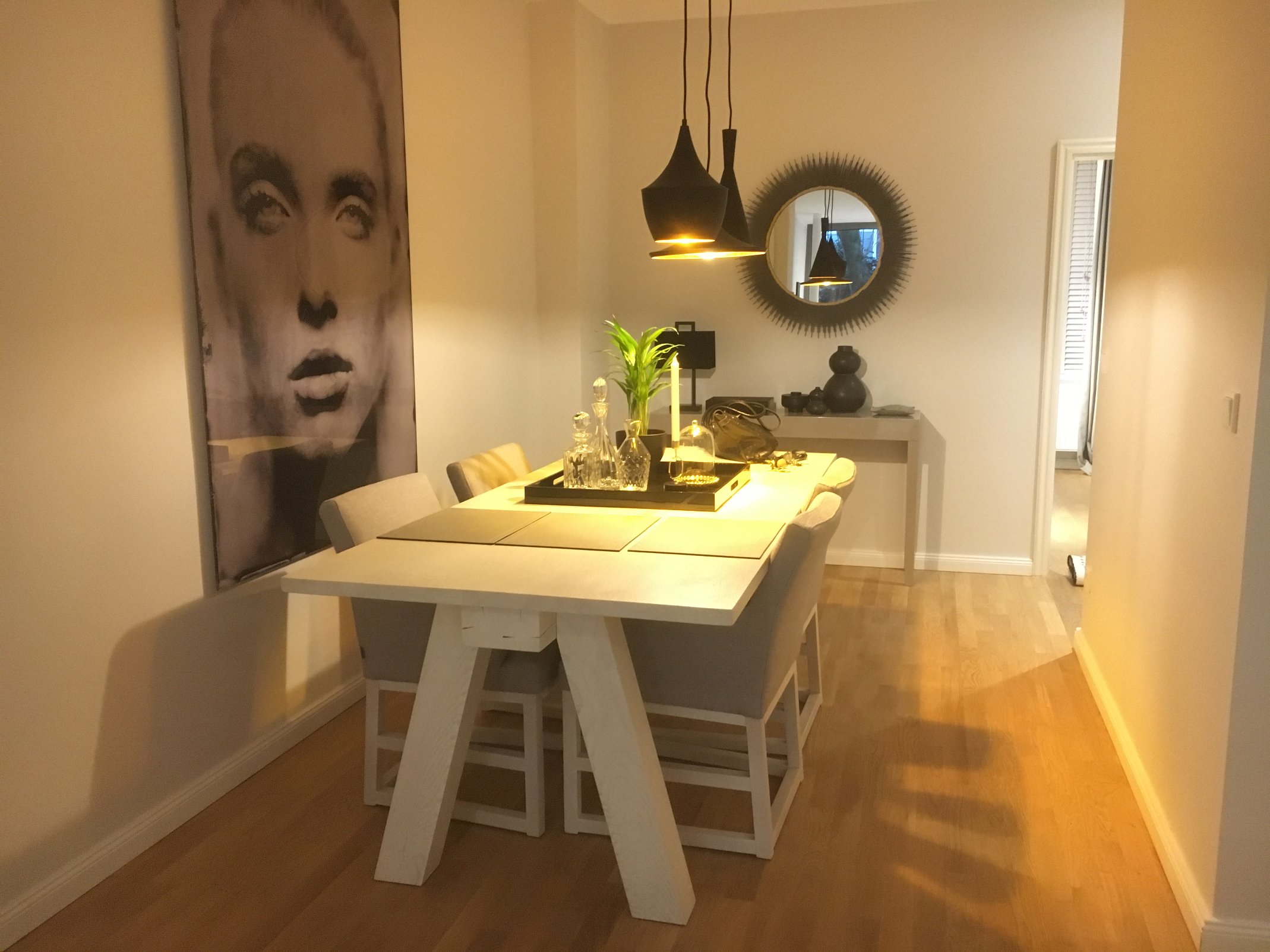 Diese exklusiv und hochwertig ausgestattete Wohnung wurde gerade umfangreich saniert, weiß renoviert, modern chic, teils im Designerstil möbliert. Sie bekam eine hellgraue, schlichte Einbauküche im halboffenen Wohnraum und eine Waschmaschine. Die Lichtverhältnisse sind optimal, da sehr große, Boden tiefe Fensterfront im Wohnzimmer und große Fenster in den beiden Schlafzimmern. Die Wände sind weiß, der Fußboden sind hochwertige Eichendielen. Die Eigentümer haben mit viel Liebe zum Detail eine äußerst geschmackvolle City-Wohnung ausgestattet, in der es Ihnen an nichts fehlen wird. In dieser neuen Wohnung fühlt sich jeder schnell wohl.